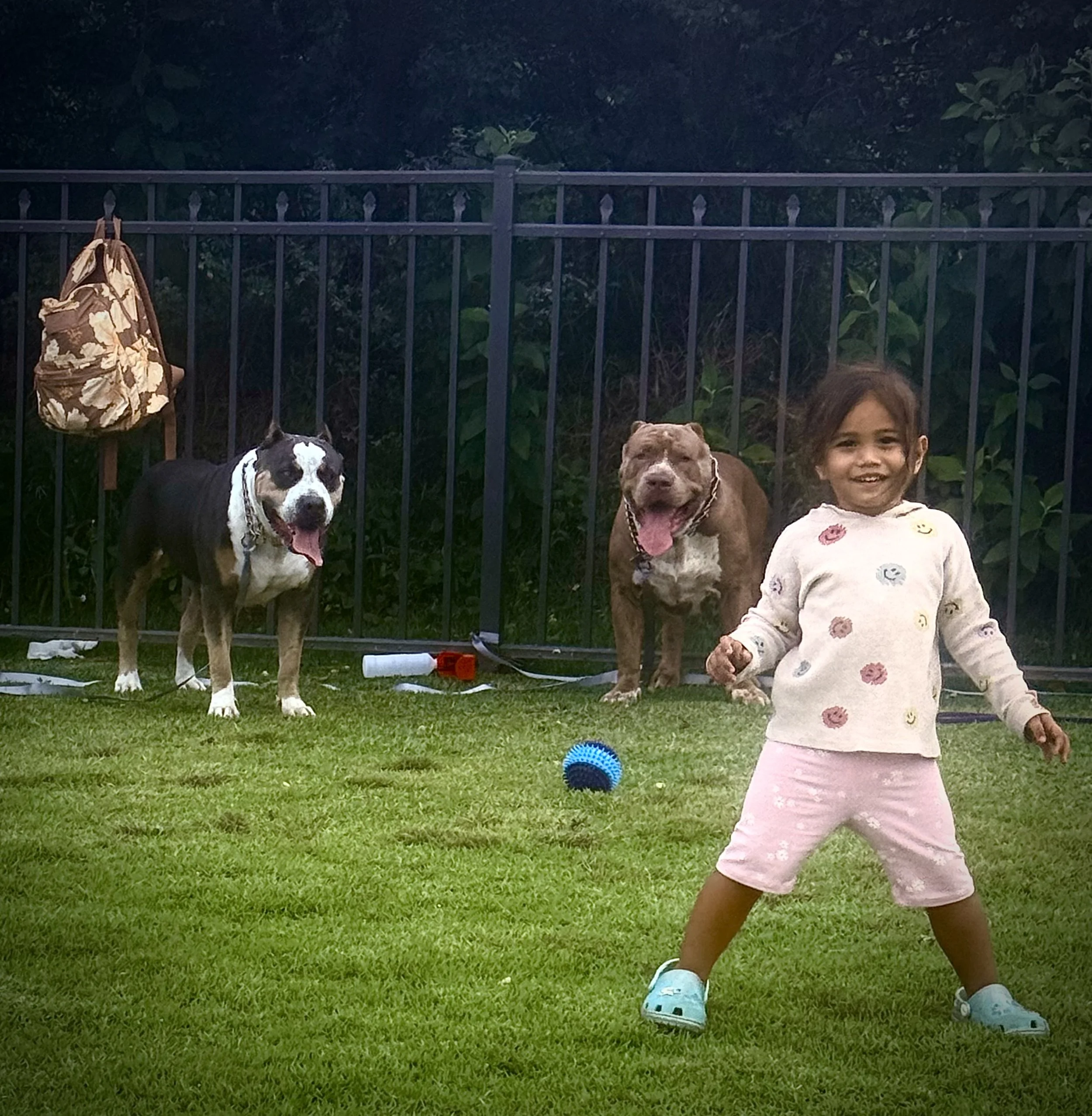 Koa complements her perfectly with his powerful build, broad head, thick neck, and commanding stance. He embodies the impressive structure and presence that the XL Bully breed is known for, with also, having a gentle and compassionate love for his family. Yet, behind that powerful look is a loyal, steady dog with a balanced temperamentand a deep bond with his people.